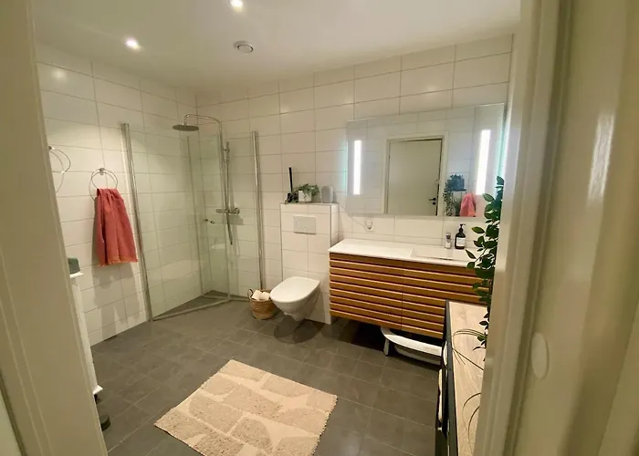 Willa Hus Til Leie Under Vm 2025 Trondheim oferuje bliskość pobliskich atrakcji turystycznych, takich jak The Ranheim Community Museum w 2 km. Przyplażowa willa oferuje przechowalnię nart, a także taras i plac zabaw.